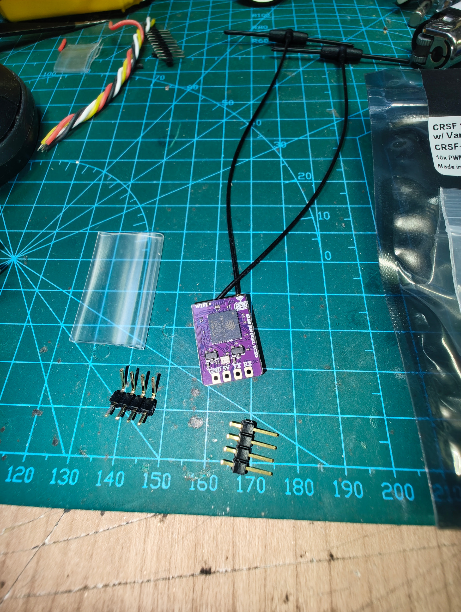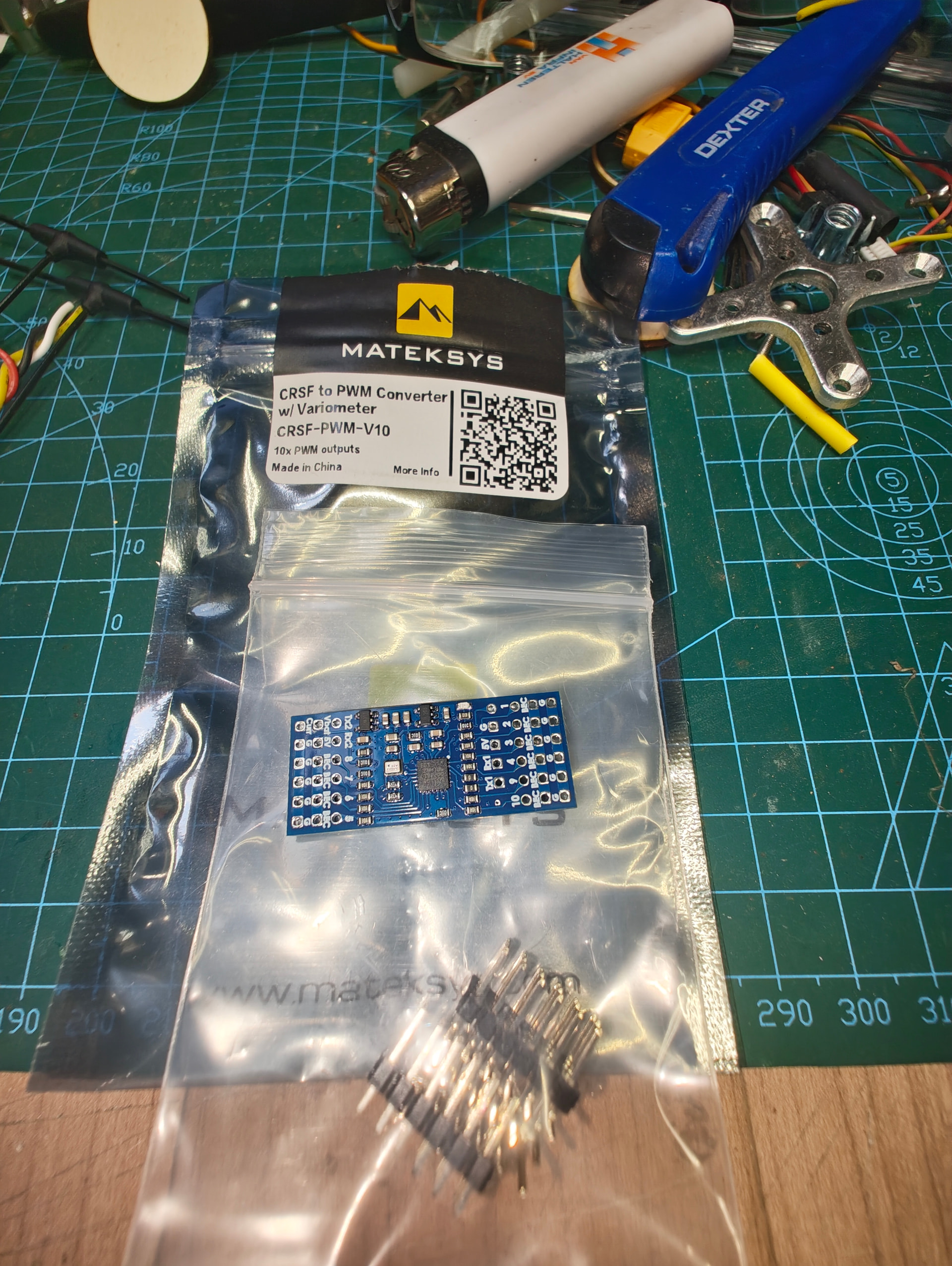 voici la partie récepteur j’ai opté pour une carte adaptatrice crsf de chez mateksys, avec 10 sorties PWM et un Vario et la possibilité de mettre un GPS si on le souhaite, elle me fait remonter aussi la tension batterie et on peut y brancher aussi un capteur de courant.