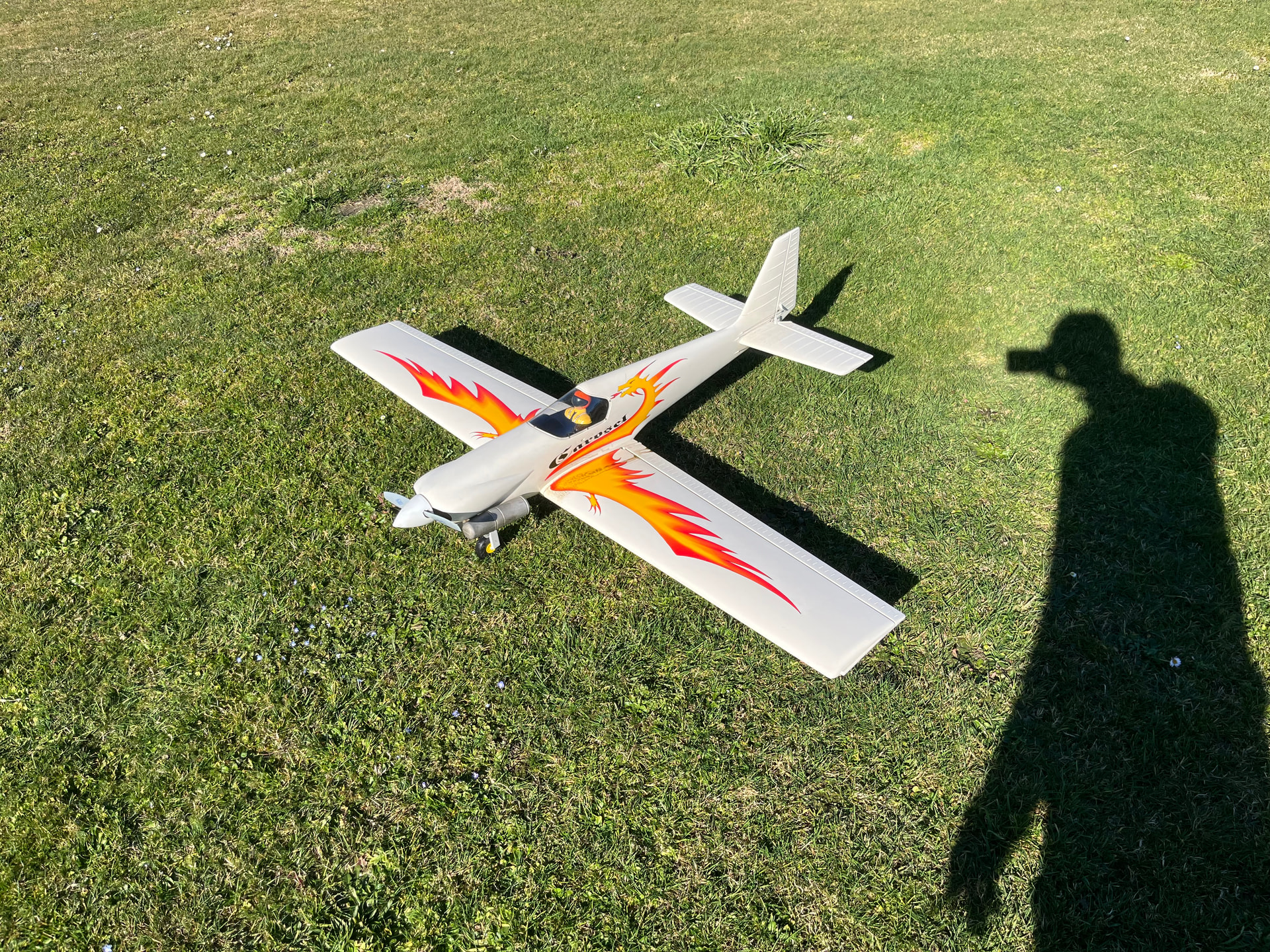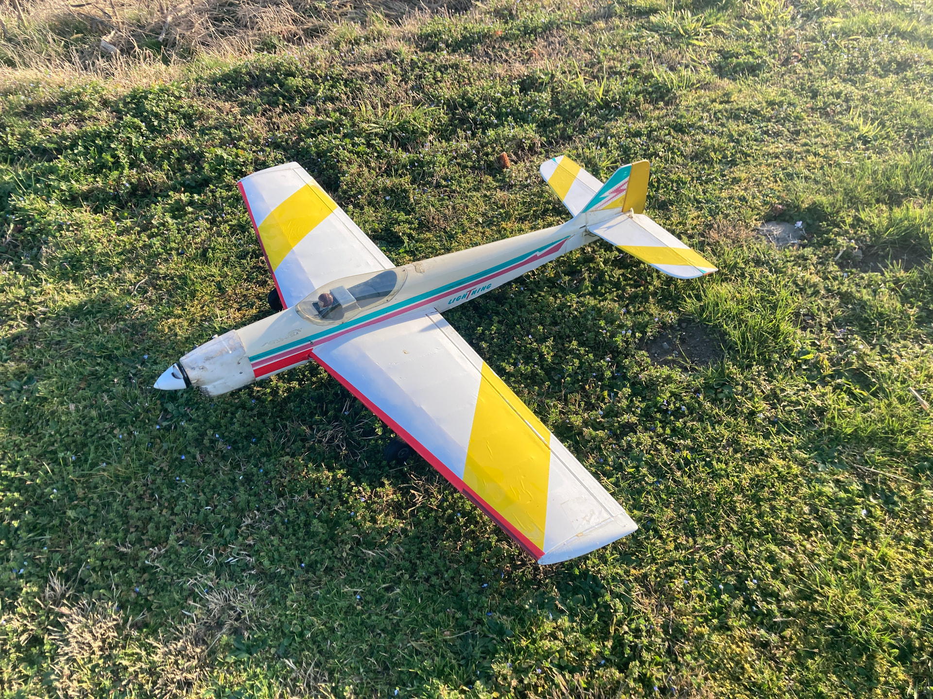 L’avion après quelques réglages afin d’affiner sa reprise volera parfaitement, passe toute la voltige, même le vol tranche emmené par le super Tigre G61 dans le pif qui n’est pas là pour faire de la figuration. Un vol avec mon petit Lightning T2M dont le 35 AX capricieux me vaudra un atterrissage moteur calé un peu sportif. Il va falloir que je me résolve à sortir le réservoir, je crois que le plongeur à un problème.
