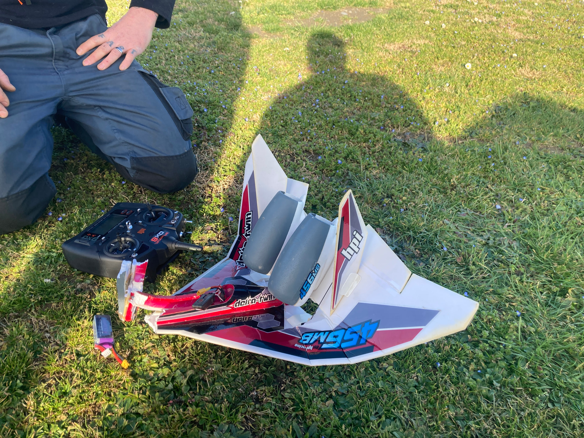 Puis vint le vol de la Delta Twin 456MB, un micro delta Bi turbine lipo. Cet engin à une histoire, il fut à moi et je n’ai jamais réussi à voler avec. Jordan l’a patiemment redressé, réparé parfaitement, mis des servos super précis, visité tout internet afin de trouver le bon centrage, vérifié sur prédim RC ensuite. Bref, tout était parfait. Le vol fût bref, une montée en chandelle, suivi d’un piqué vertical. Le résultat : une magnifique œuvre d’art, que le fameux Sculpteur César, célèbre pour ses fameuses compressions n’aurait pas désavoué.