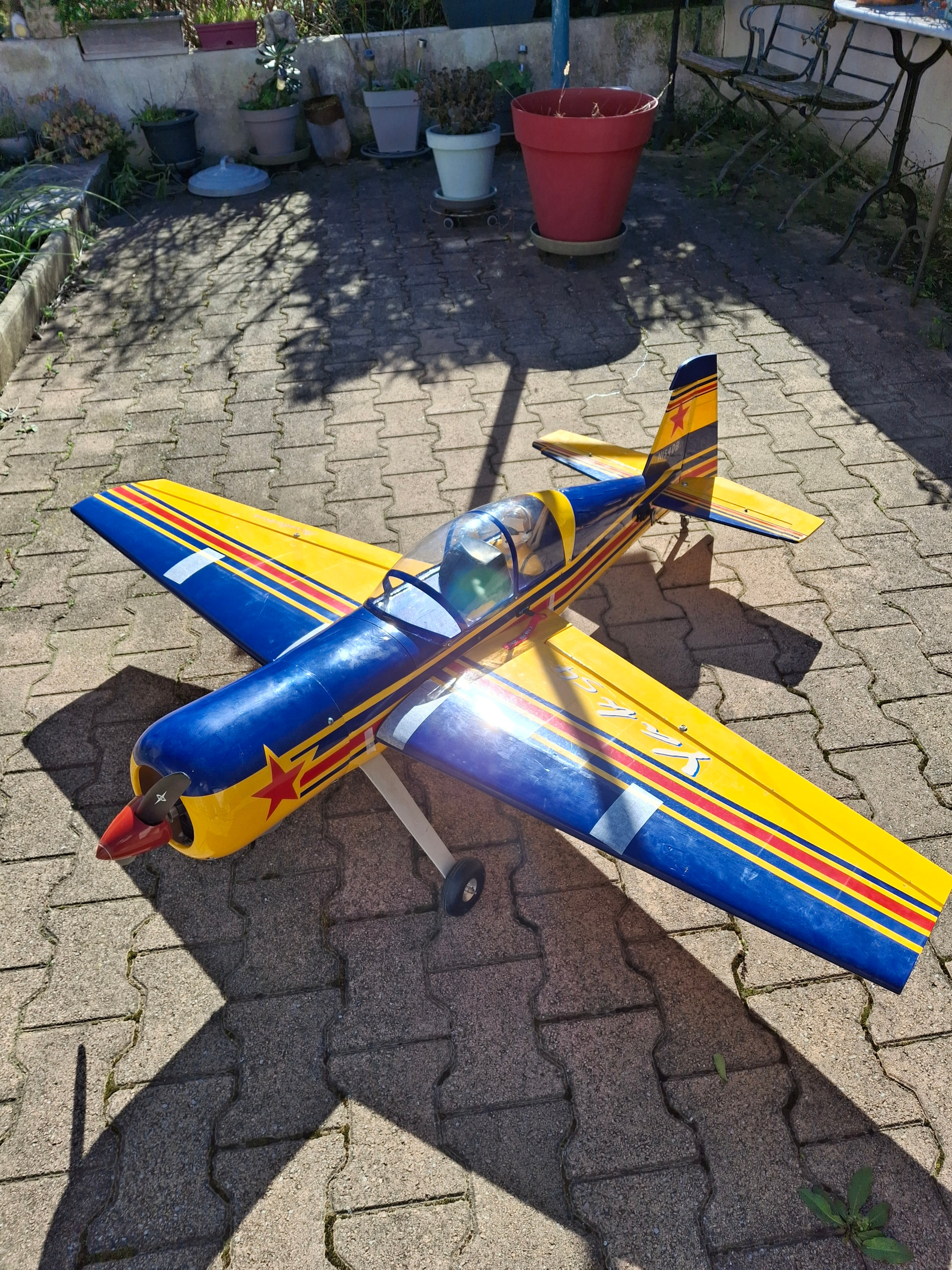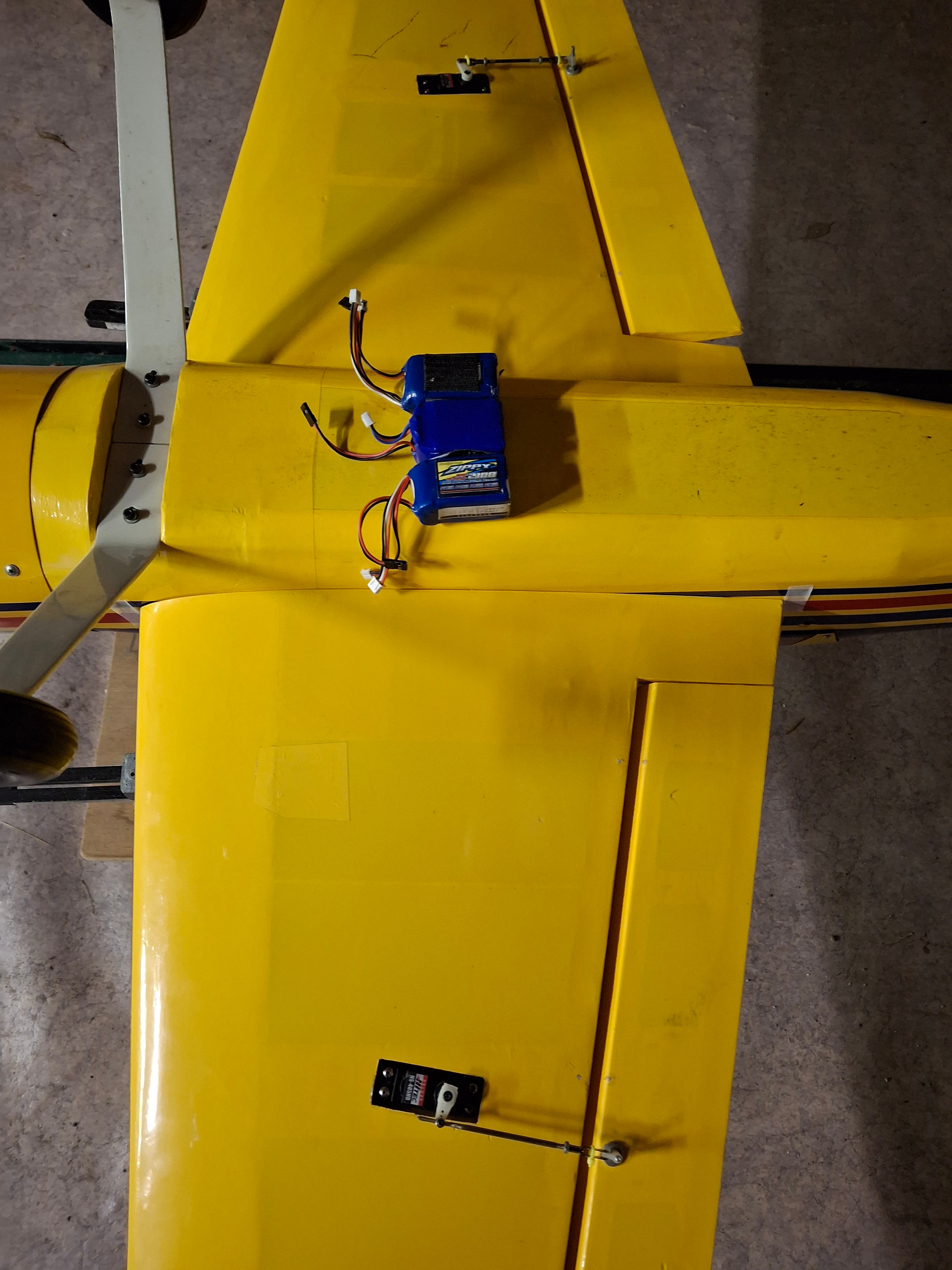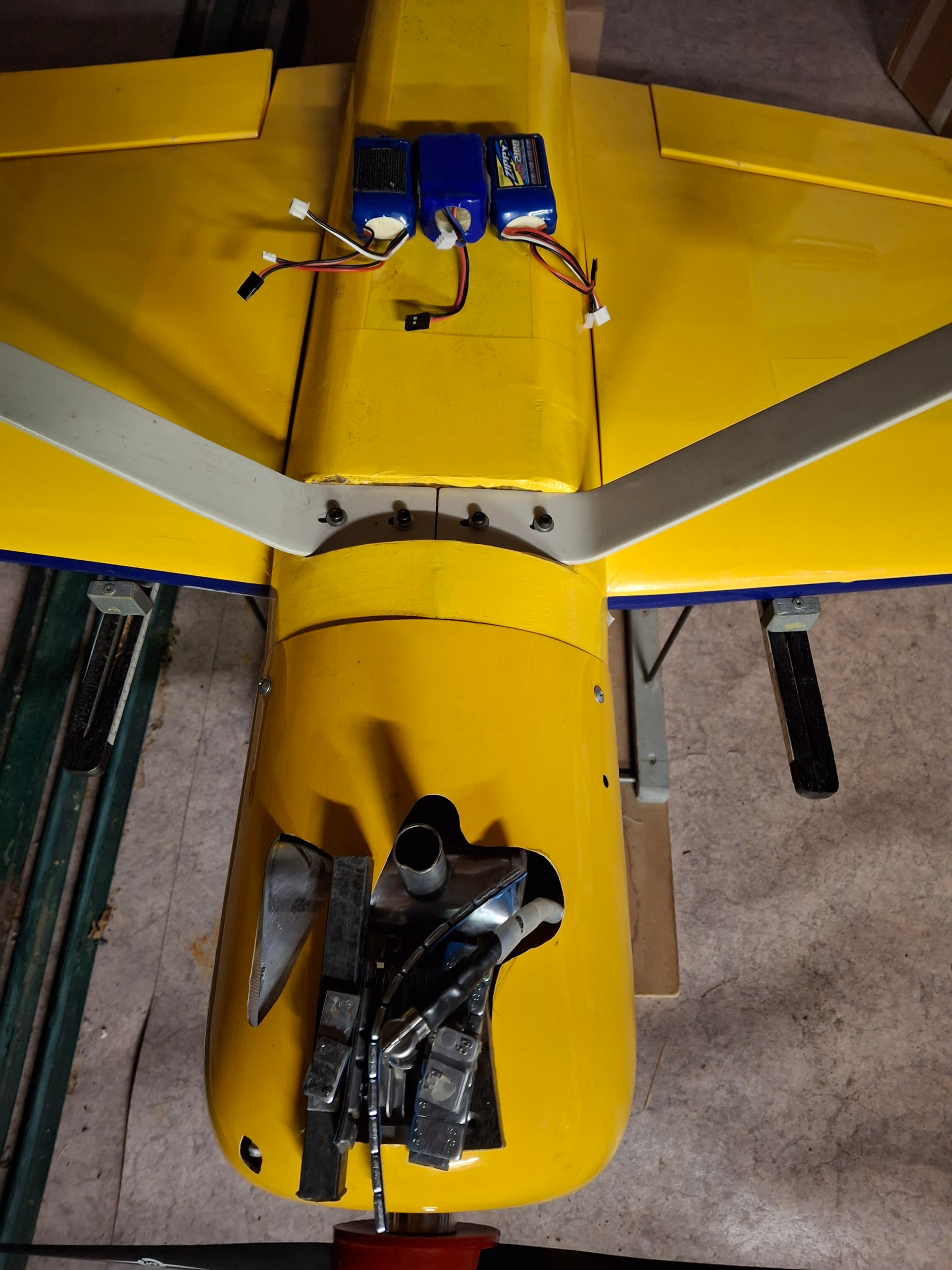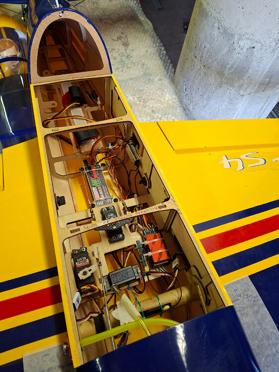 Bonjour Je finalise le Yak 54 et je ne comprends pas comment le propriétaire précédent a pu voler avec cet appareil. Si je respecte l’implantation des batteries fait par ce dernier (photo 3), je me retrouve à devoir rajouter une importante quantité de plomb à l’avant…Je précise que je n’ai rien modifié depuis l’achat de ce modèle; moteur réservoir allumage électronique servos etc…D’autre part, s’agissant d’un modèle d’une quinzaine d’années ou plus, je n’ai aucune référence de CG. Pas de marque sur l’avion. Je suppose qu’il s’agit soit d’un phoenix models soit d’un seagull models. Le CG que je trouve sur le net pour une envergure de 1,60m des différentes marques est de 100mm de part et d’autre du fuselage ou 80mm au milieu de l’aile ce qui est la même chose. J’ai supprimé les supports batteries afin de les implanter le plus en avant possible mais j’avoue ne pas comprendre comment la personne a pu voler avec la configuration au moment de la livraison…