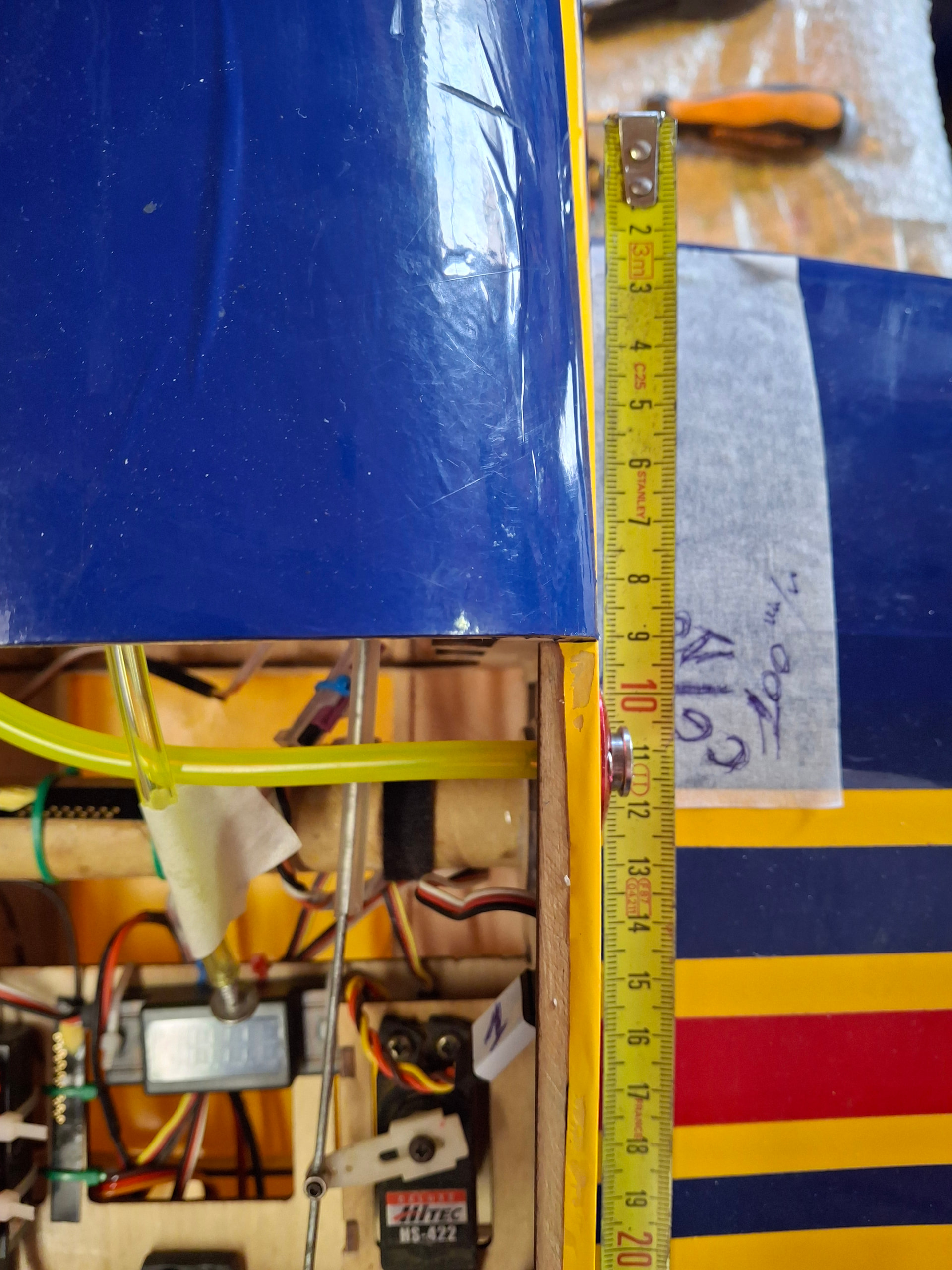 Quand tu regardes la photo ci-dessous, le centre fourreau clé d’aile est à 125mm. Pour info la longueur de l’aile est de 72cm, lalargeur de l’aile côté fuselage est de 45cm et celle du saumon est de 21cm.