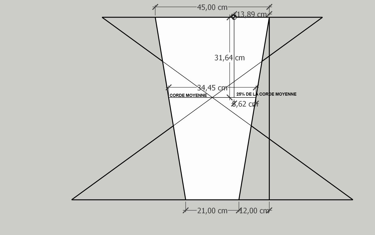 Bonjour, je viens de rentrer les données, il semble que si les mesures que tu m’as donnée sont bonnes, nous arrivons à un centrage de 105,8 mm à partir du bord d’attaque de l’aile.