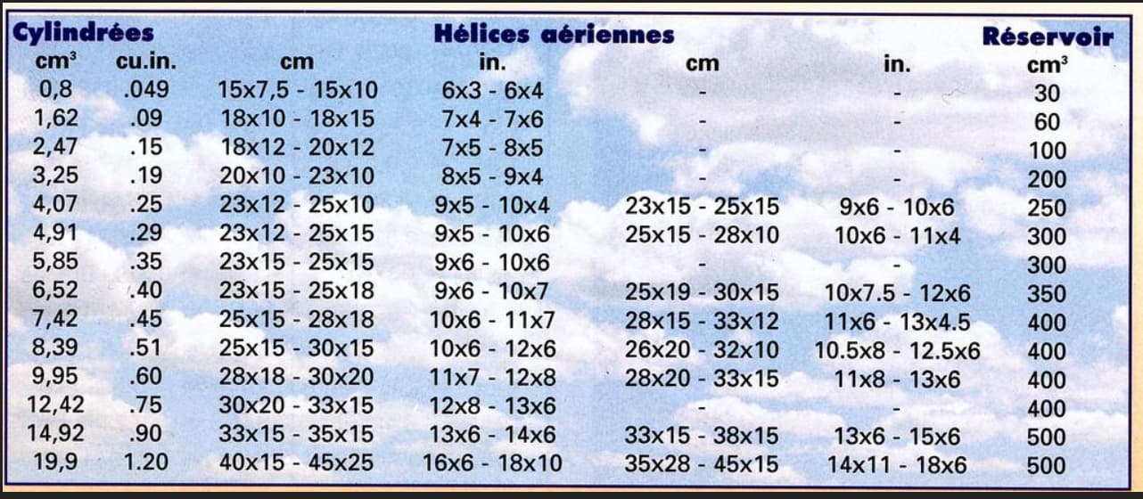 Point de tout ça pour un thermique, se gourer d’hélice risque rarement de bousiller le moteur, et généralement sur la plupart des kits thermiques, une préconisation de cylindrée moteurs est présente sur le plan ou le kit.