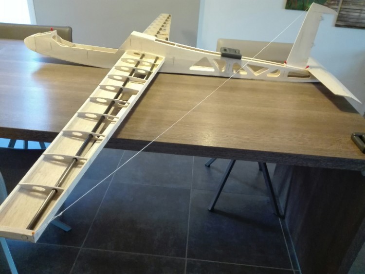 Hier j’ai effectué la mise en croix à blanc (stab et dérive puis ailes) de manière parfaite alors j’ai collé tout le carbone. Mais après séchage j’ai 2mm d’écart entre ailes droite et gauche D’abord déçu, je me suis ensuite dit que c’était finalement nécessaire pour avoir une marge de progression