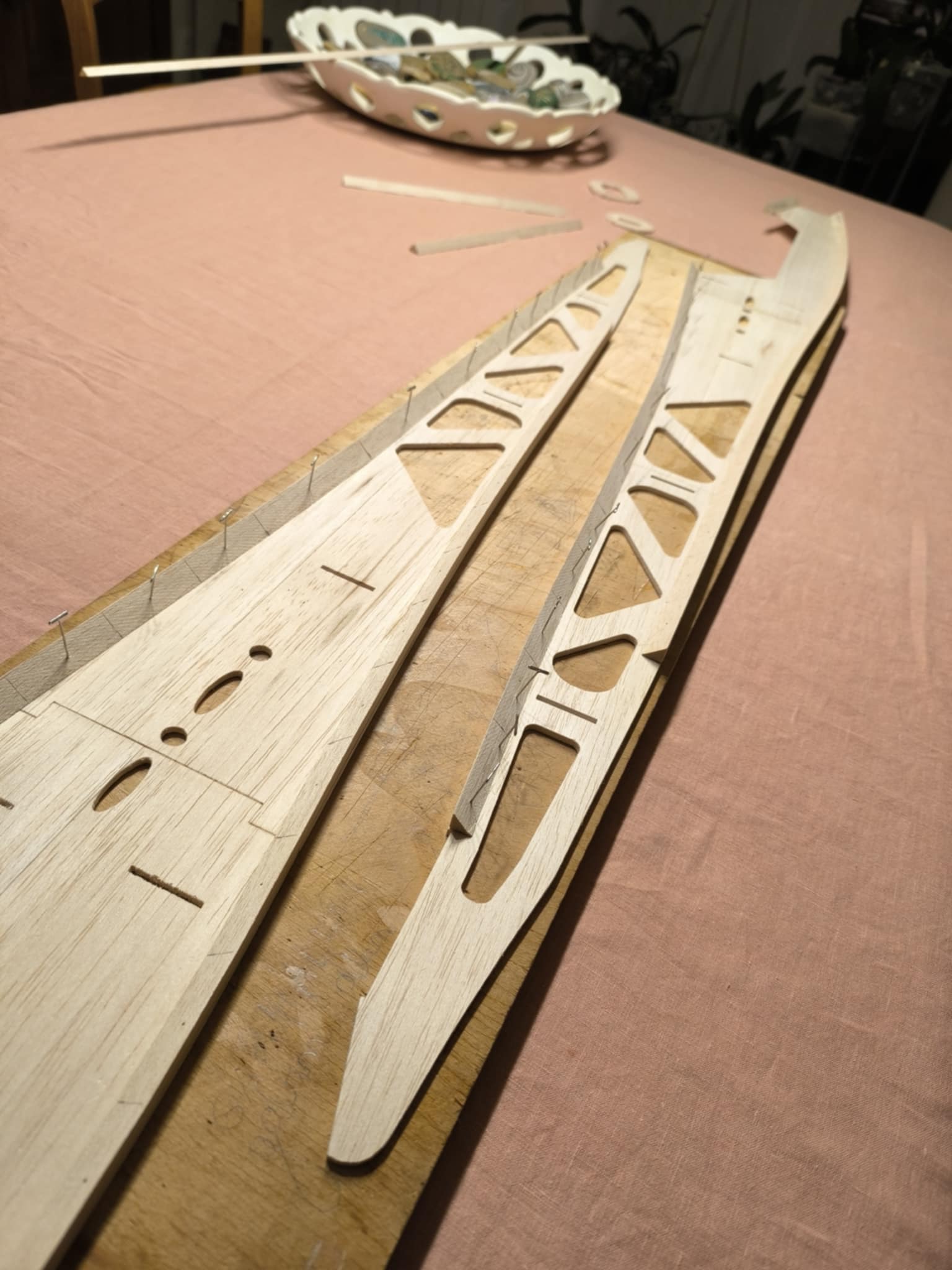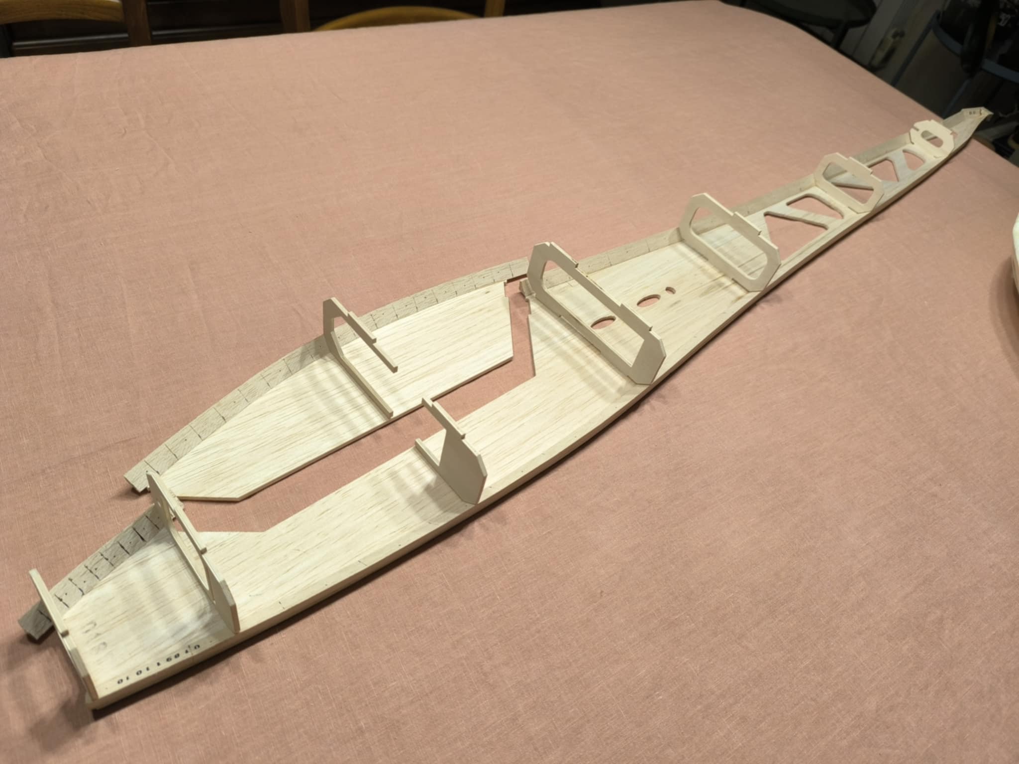 La préparation du chantier passe par une phase de nettoyage des pièces, couples, nervures etc… car la découpe CNC a une fâcheuse tendance à laisser des peluches sur les planches usinées.