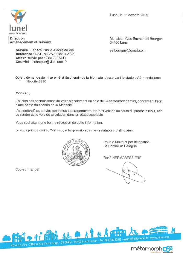 Je vous sollicite pour poster une demande sur le site « allô Madame le Maire » la demande de remise en état du chemin d’accès du stade municipal d’aéromodélisme.