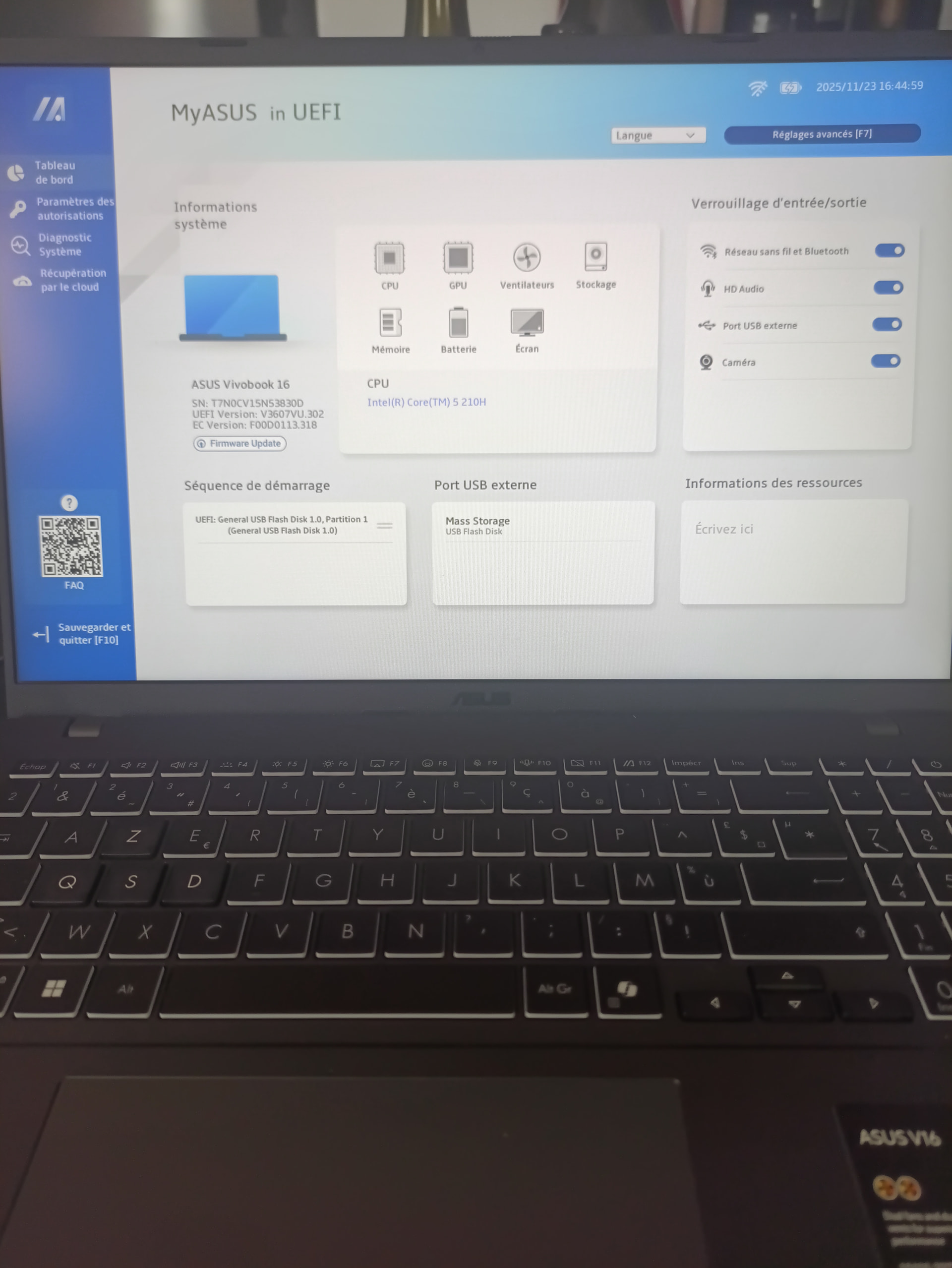 En tapotant sur [ESC] (ou [F2]) au démarrage tu dois avoir le menu « Please select boot device » ce qui te permet de sélectionner ta clé USB pour booter dessus.