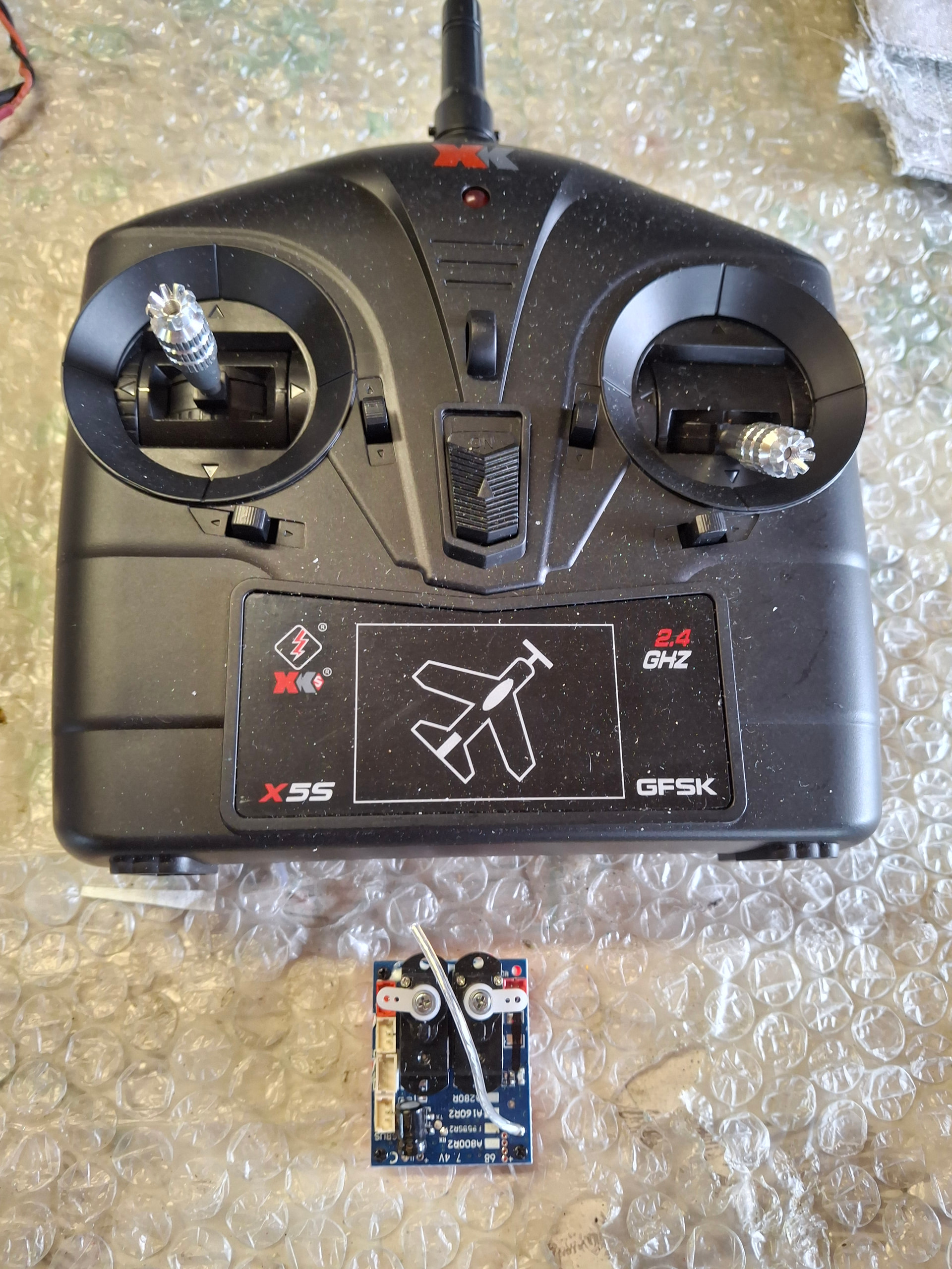 La radio et le module réception/servos proviennent d’un XK (RTF) A300 Beechcraft D17S Staggerwing avec 2.4GHz 4ch Tx & 6-Axis Gyro EPP 550mm (RED) (voir caractéristiques techniques. Gyro 6 axes?)