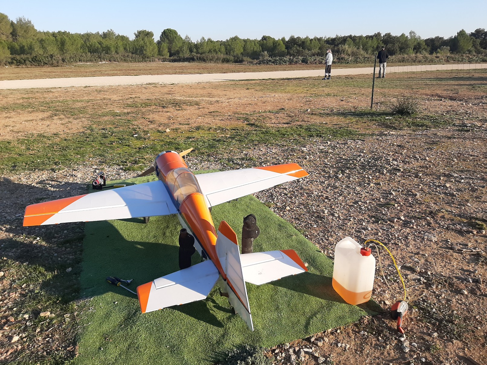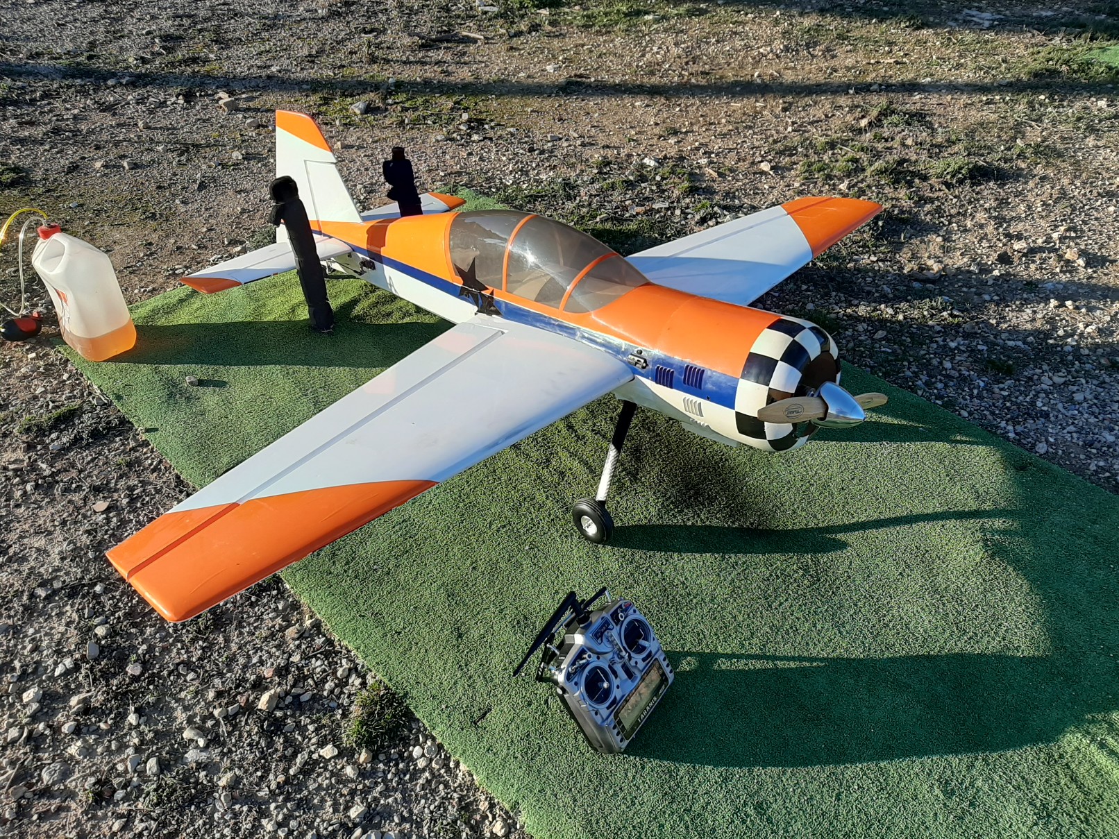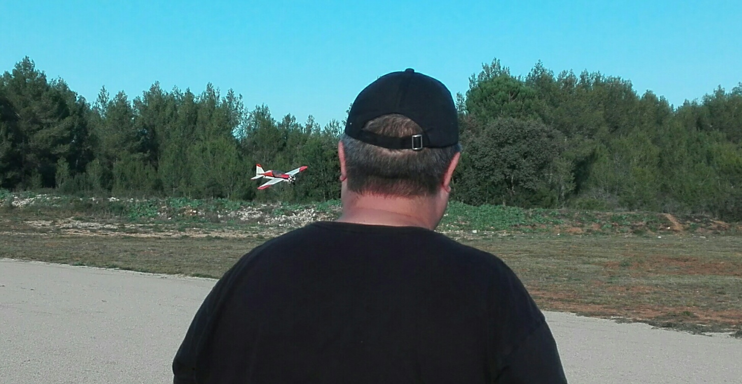 Allumer la radio, se rendre compte que les ailerons ne sont pas branchés. Dévisser la verrière, s’apercevoir qu’une prise de servo est coincée dans l’aile, démonter l’aile, bancher la prise servo, remettre l’aile, revisser la verrière…