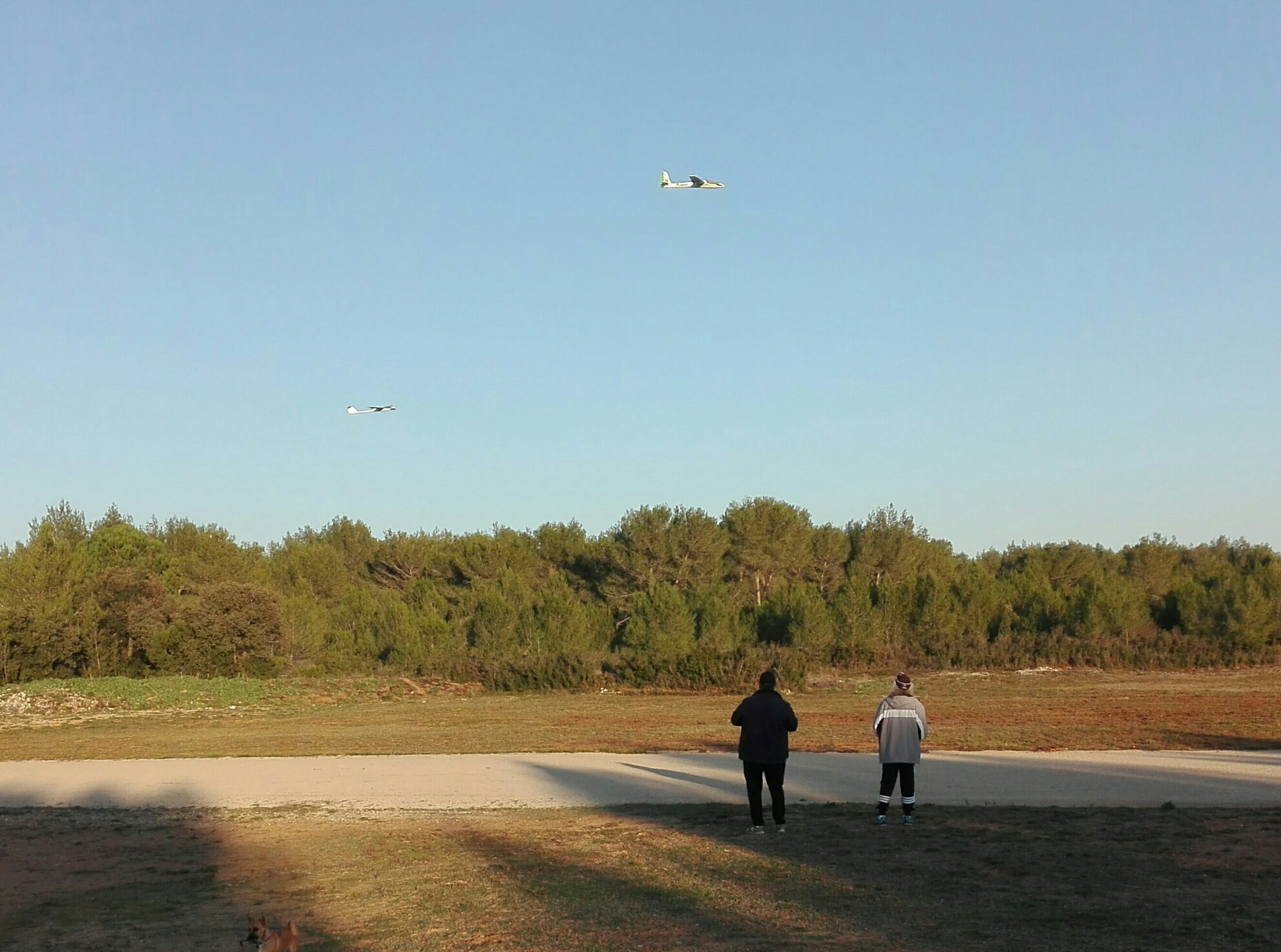 Quelques chasseurs passent en bordure de piste, ratent un perdreau, et GG n’aime pas entendre passer les plombs. C’est vrai que percer la casquette neuve, c’est le chien qui va se rouler par terre au retour… A l’avenir nous devrions armer quelques avions, je crois qu’il me reste quelques grenades à plâtre modifiées de leur contenu… (qui n’est donc plus du tout du plâtre).