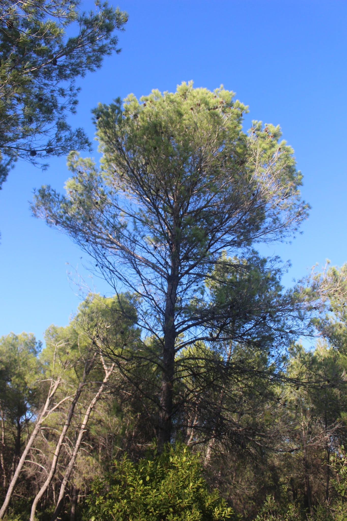 En cherchant les confettis, on a constaté que beaucoup de pins paraissaient malades. Ils sont en train de se dessécher et il serait judicieux de leur porter le coup de grâce pour qu’ils ne souffrent plus…