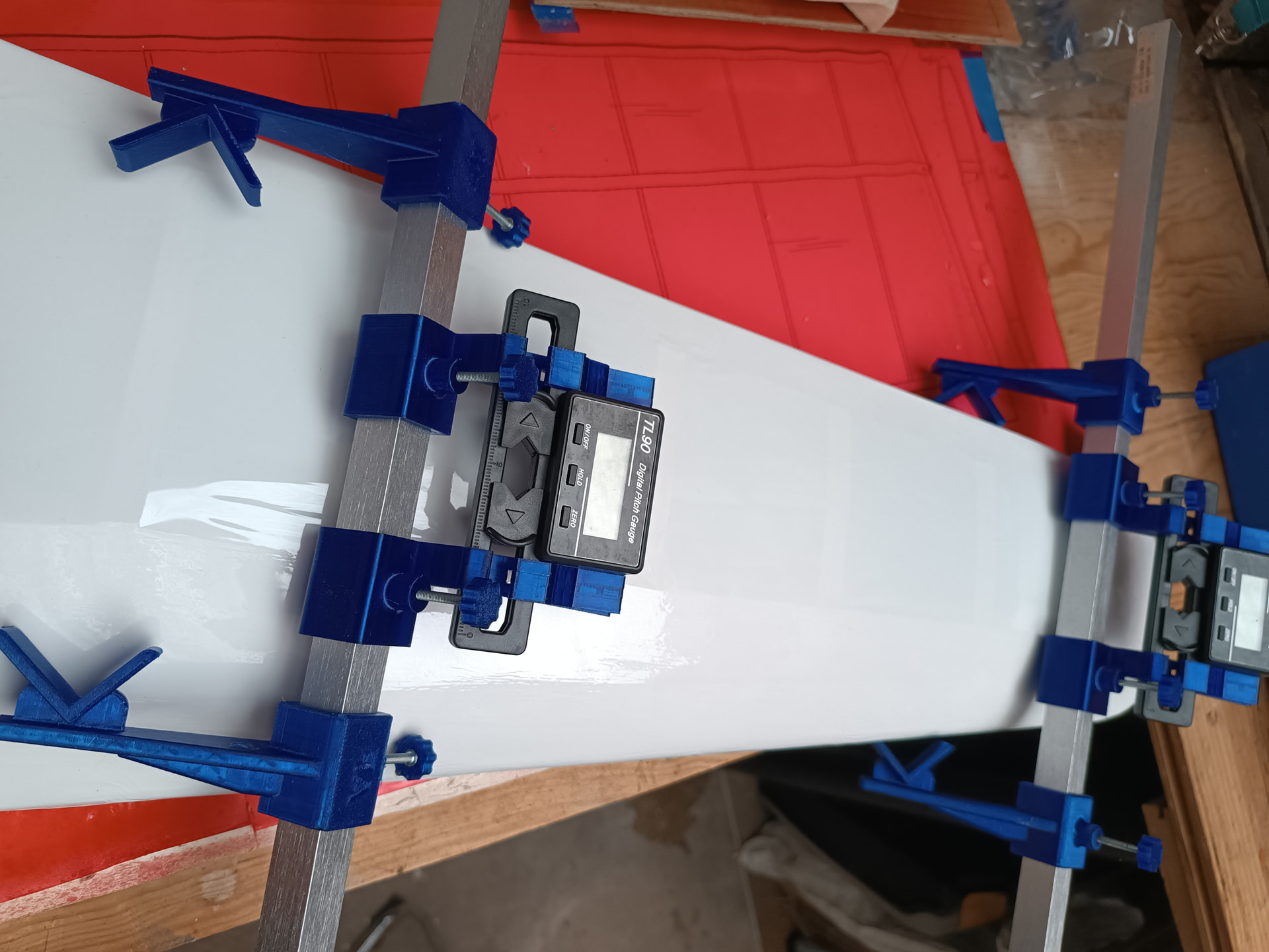 Je me suis fait 2 incidence-mètre ( voir photo) que j’étalonne à l’emplanture. J’en fais glisser un, vers le saumon et je vois le décalage, le vrillage.