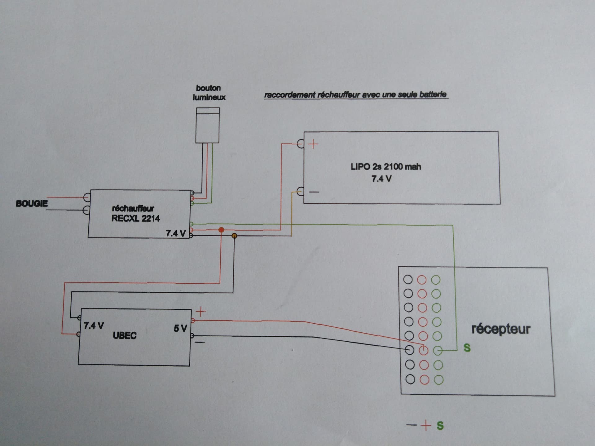 Le réchauffe bougie du T180 fonctionne par intermittence comme si il y avait un faux contact dans le câblage, ce que je suis en train de rechercher mais j’aimerai être sûr que mon câblage est correct. Dans la notice du réchauffe bougie il est précisé que ce dernier n’est pas protégé pour une tension d’alimentation inférieure à 7.4 v et il est préconisé d’utiliser une une lipo 2s.