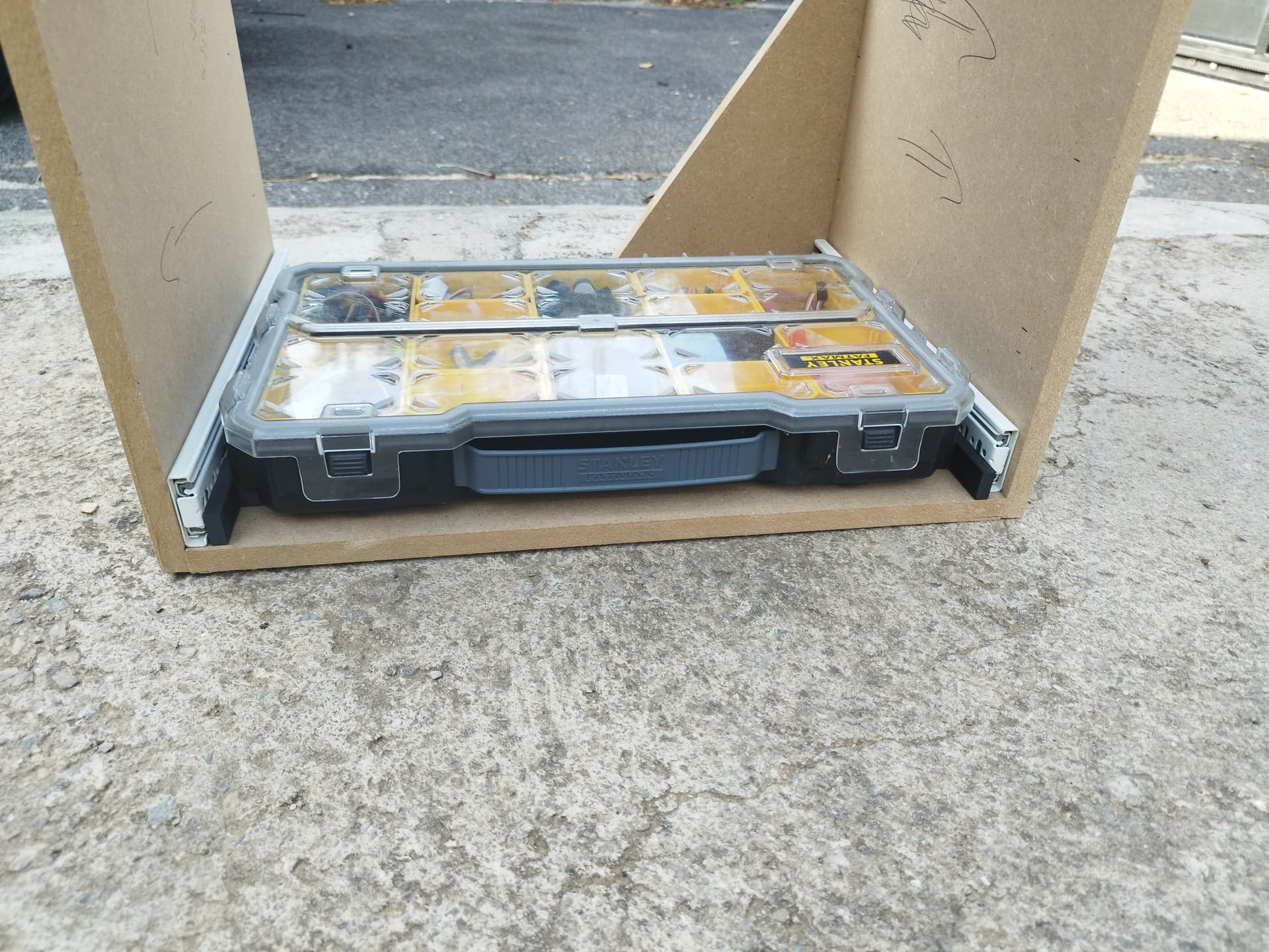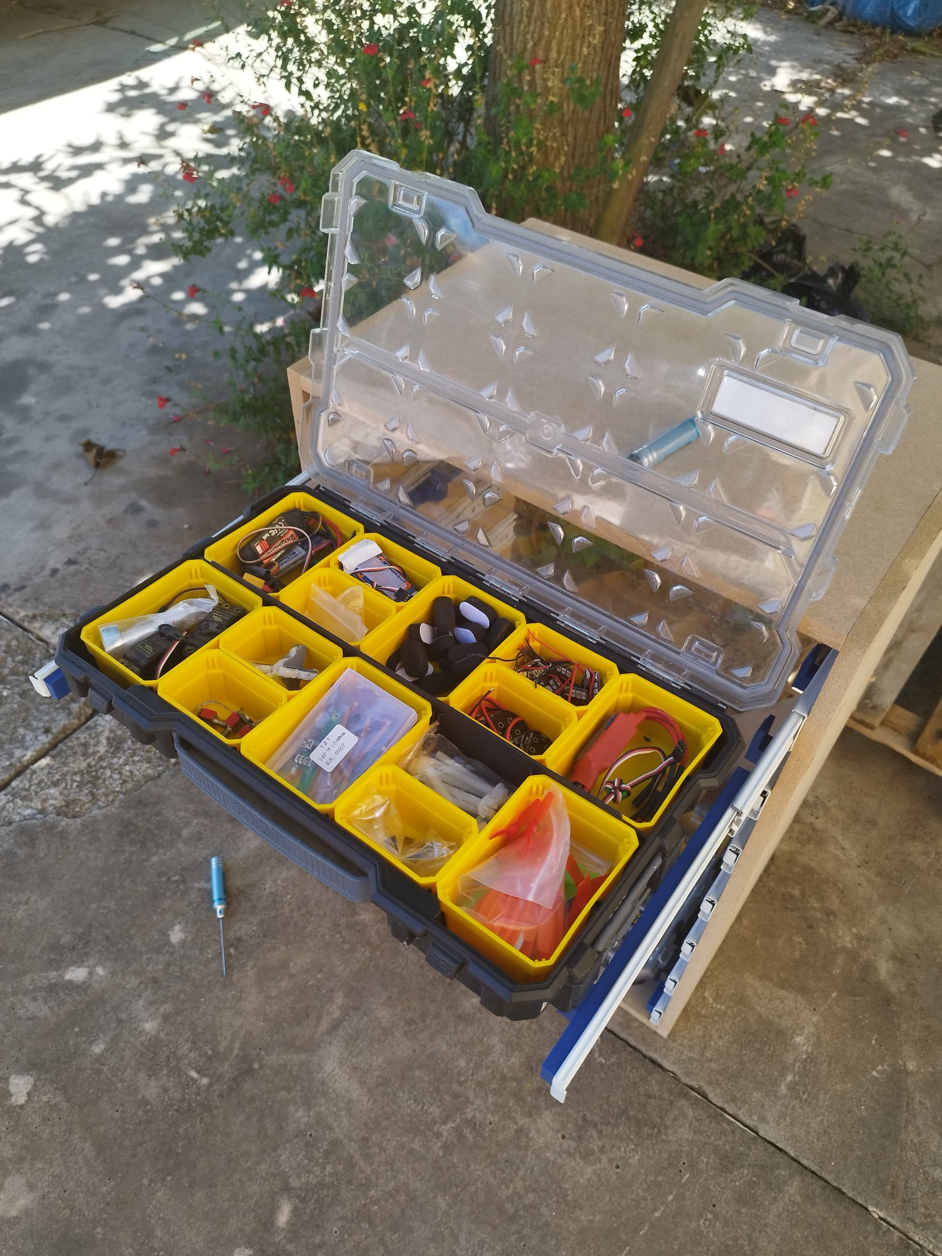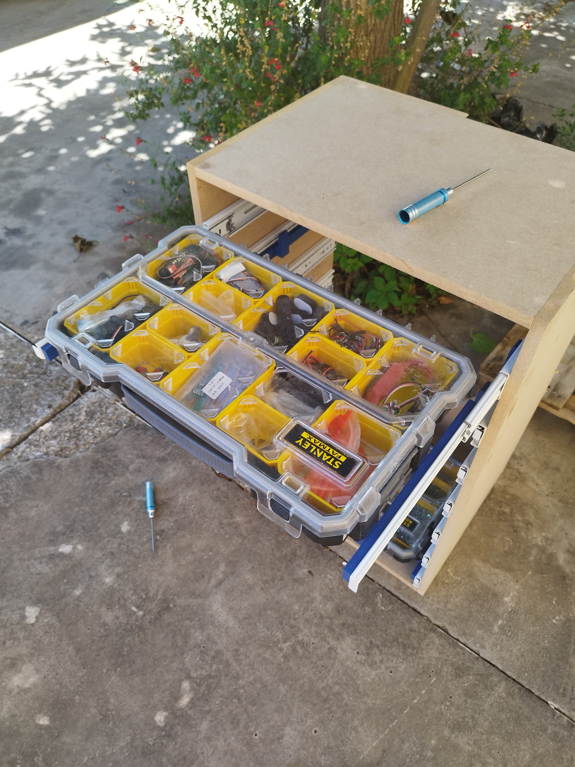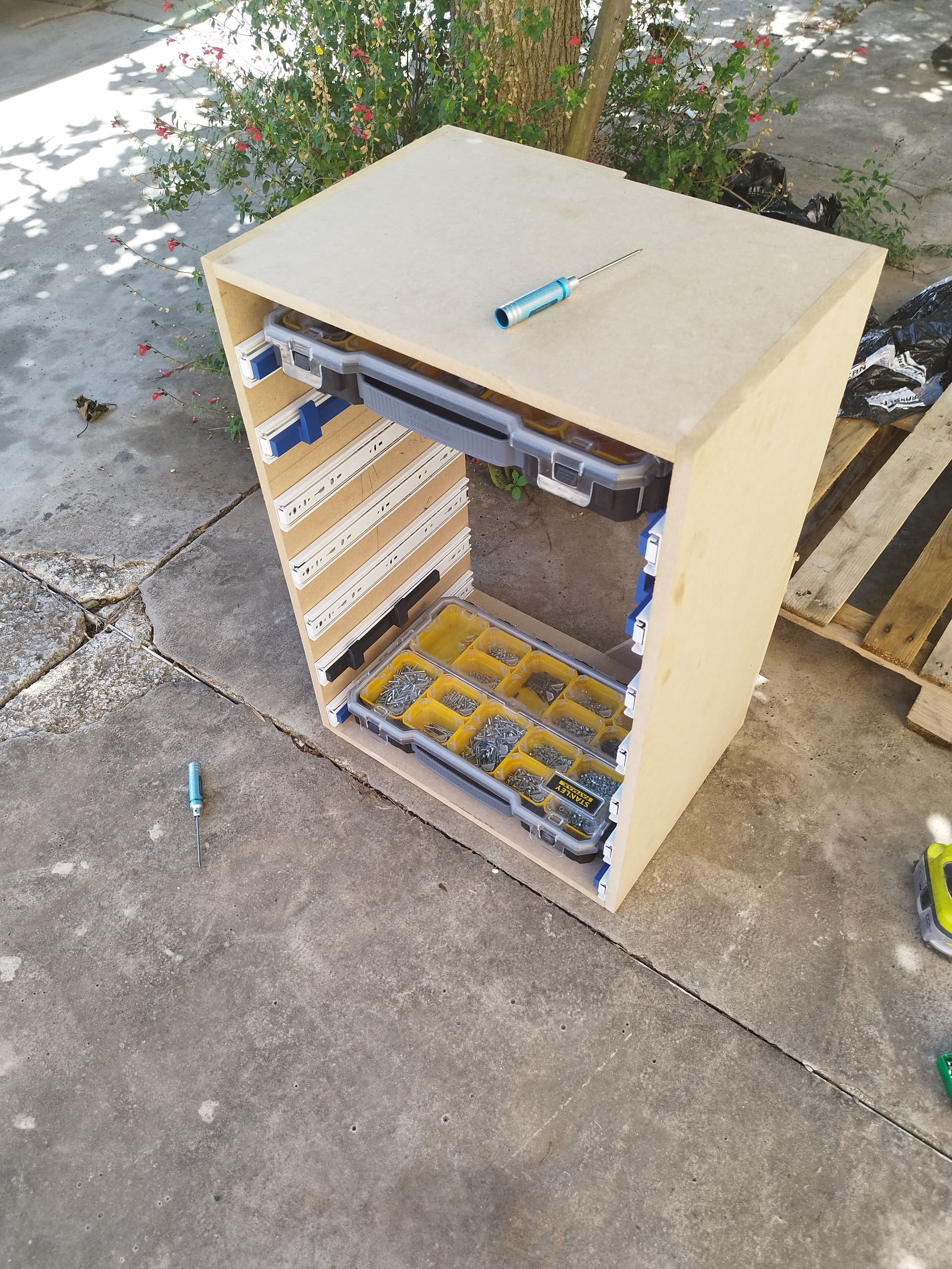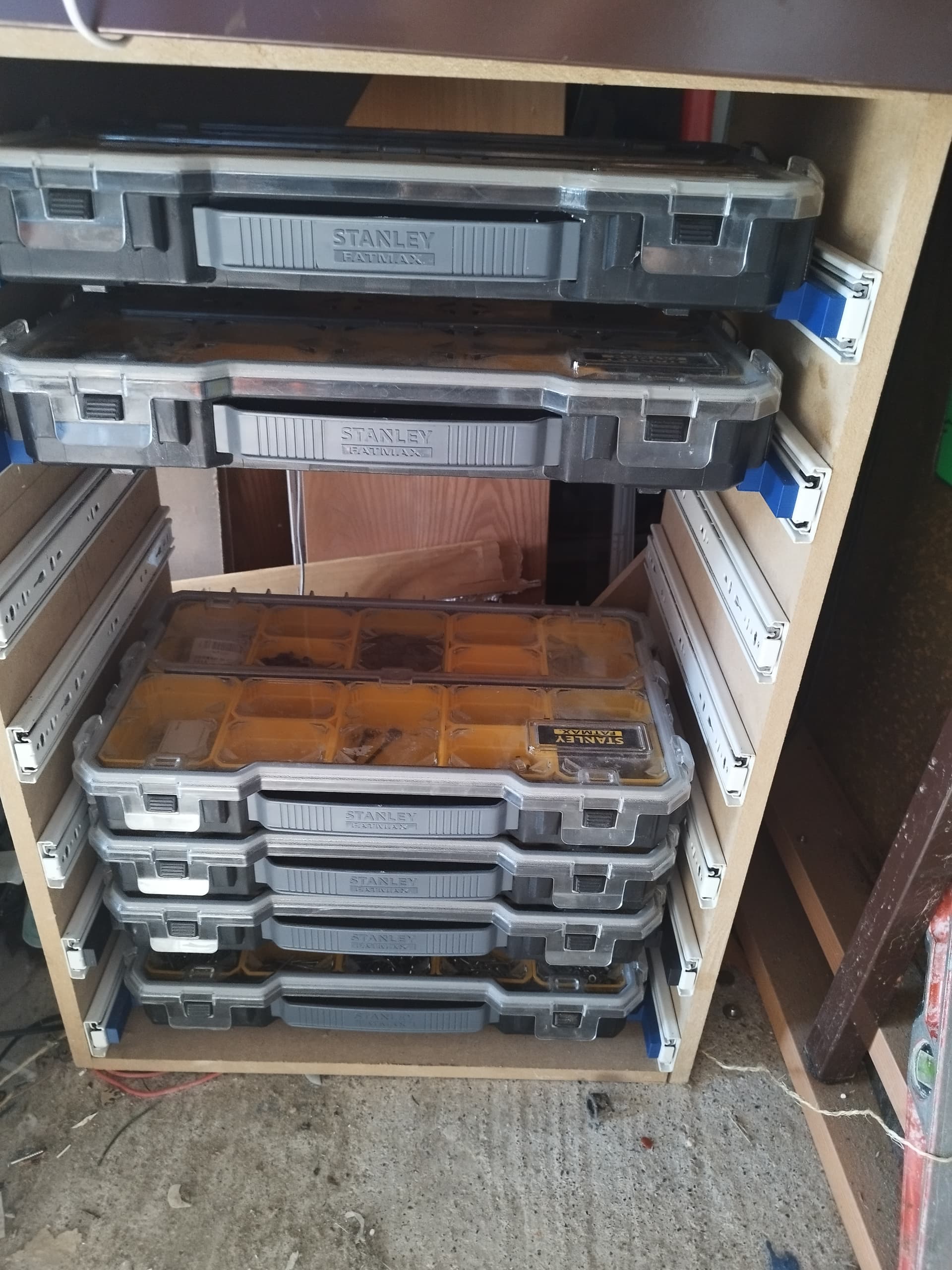 Je range mes affaires a l’atelier dans ces boîtes à casier Stanley qui sont pas mal à part qu’elles sont dispersées partout dans le garage.