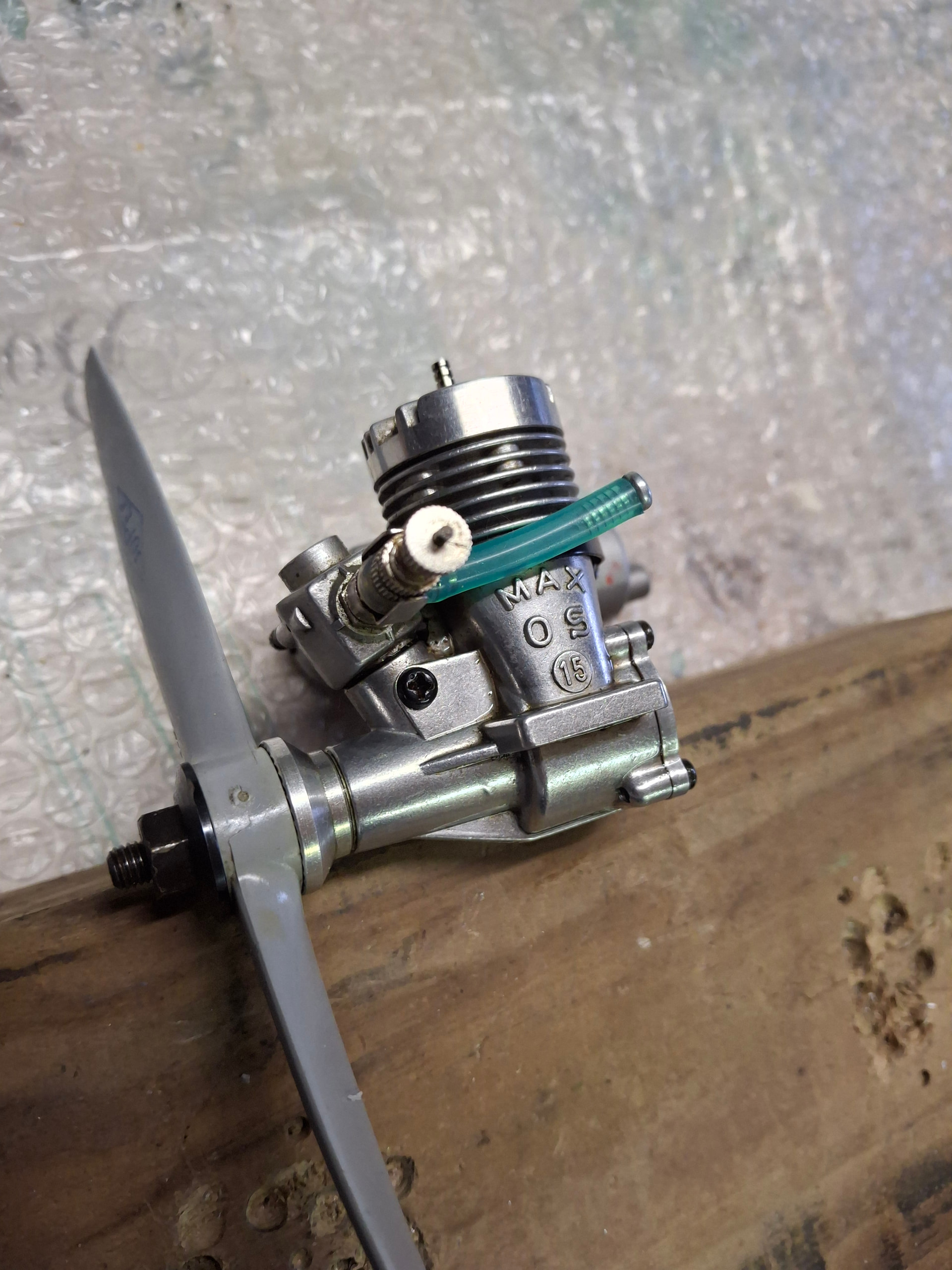 Après une mise en température, le petit OS 15 avec une hélice 7x4 s’est fait une pointe à 15800tr/mn. Je pense que ce moteur que j’avais dans le lot qui m’a été donné, a très peu tourné compte tenu de sa présentation, photo ci-dessous.