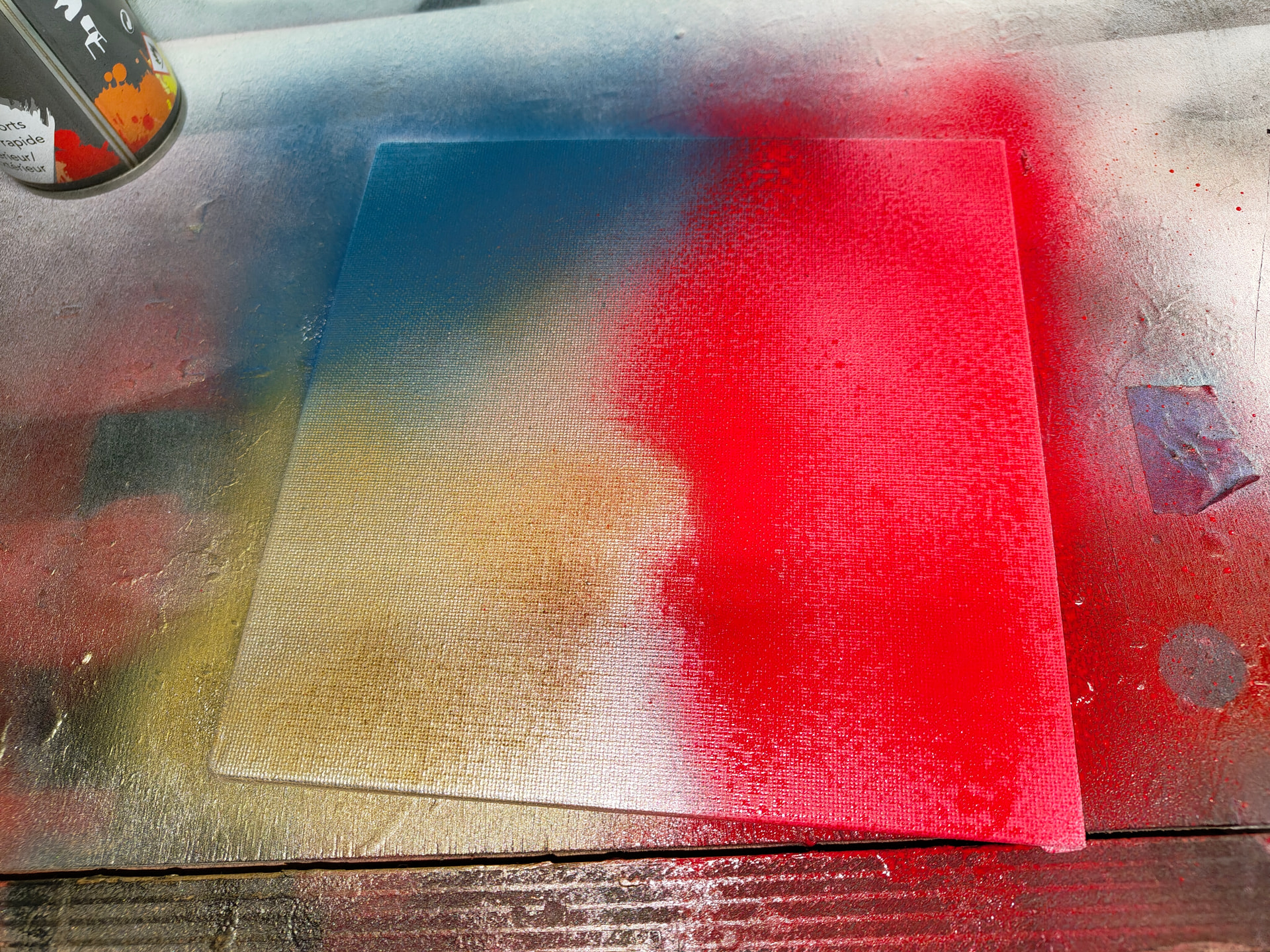 Du coup nous prenons une toile on passe une première couche de couleur à sa guise là on peut voir un mélange de trois couleurs.