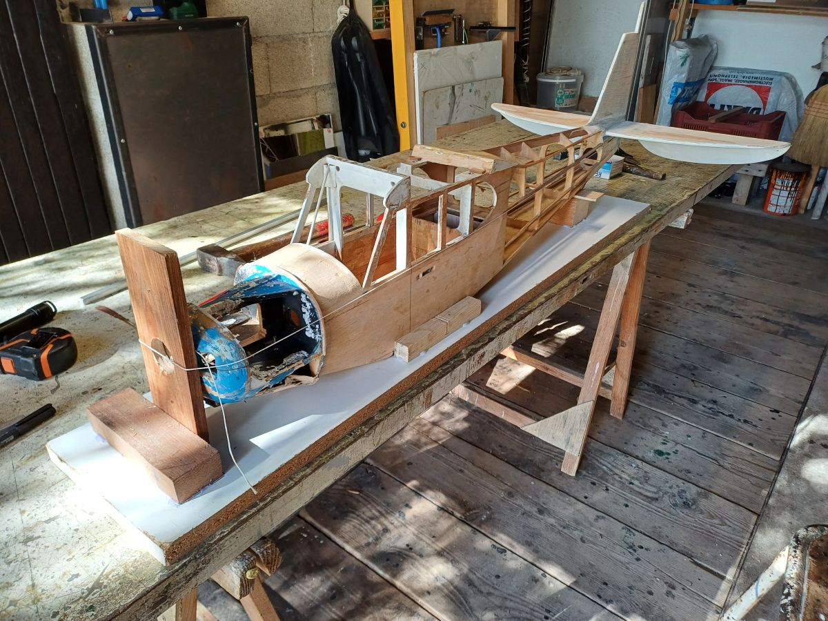 Préparation du banc sur lequel l’avion est posé sur sa ligne de vol en palier, ceci pour me permettre de déterminer le calage du piqueur, de l’anti couple, et la position de l’arbre moteur.