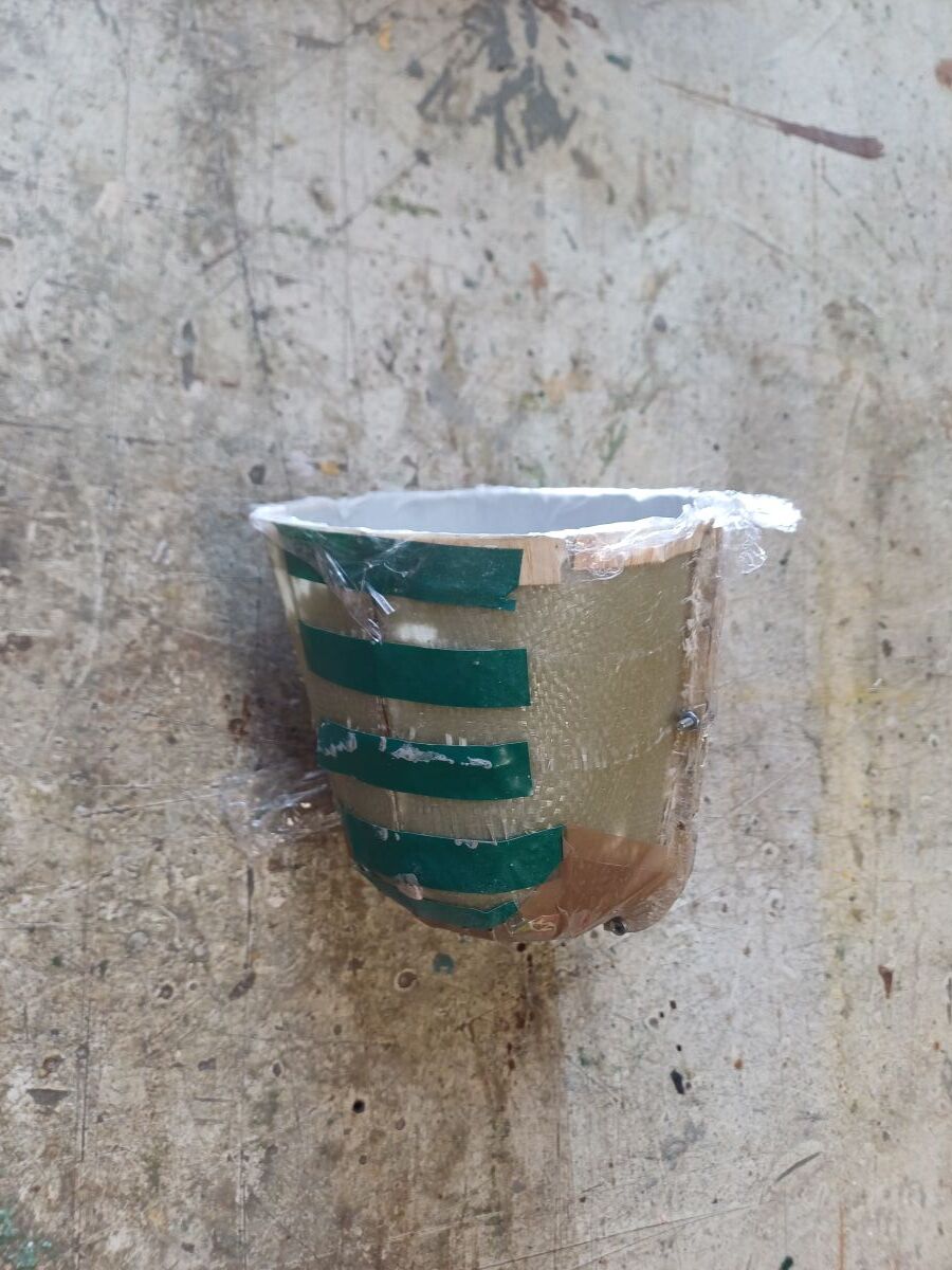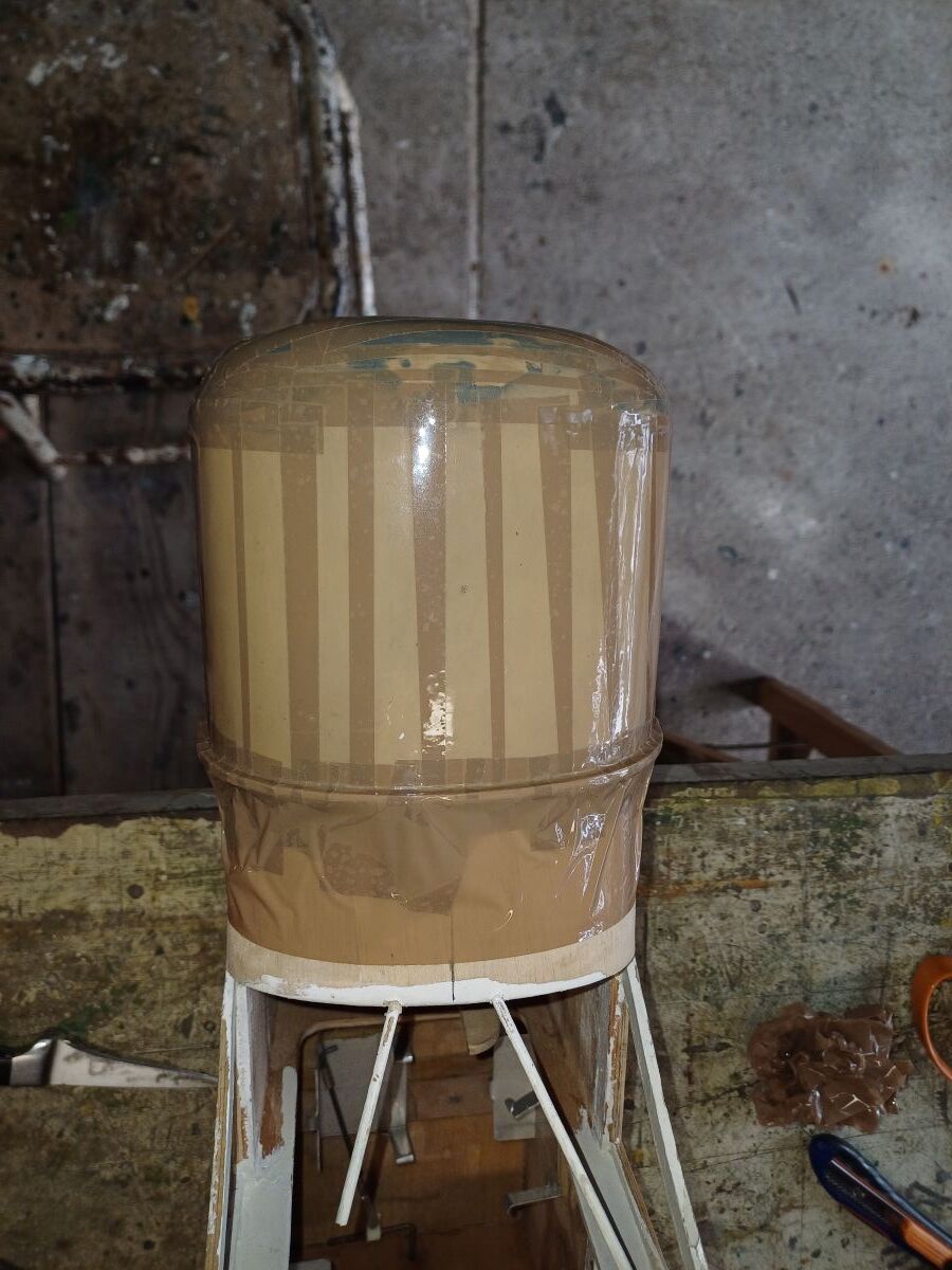 Un peu échaudé je fibre le nez avec du gros tissus de verre afin de réaliser un moule en 2 parties (ci dessus). Et là j’en ai vraiment vraiment bavé pour le démoulage. Pourtant le scotch était bien lisse et garni de plusieurs couches de cire.