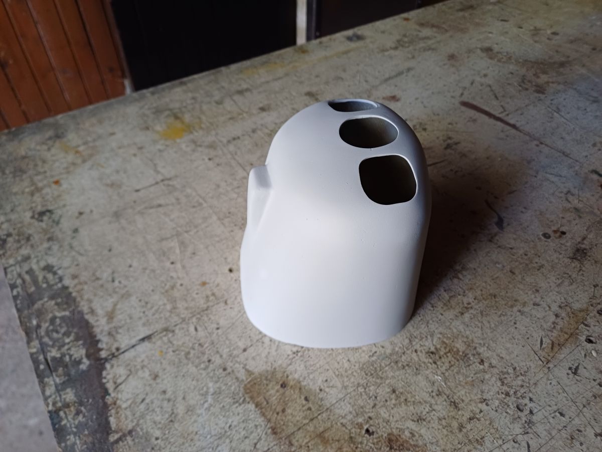 Préparation du nez (ci dessus) pour la fabrication du moule. RGB me propose gentiment de le scanner, ceci est fait et bien fait, il me passe le fichier, j’imprime le moule en 2 parties, je suis super content les 2 parties du moule s’ajustent bien, quand je reprend mes travaux un mois plus tard une des 2 partie s’est déformée en courbe avec une flèche d’au moins 5 mm. Je n’ai rien compris et je me gratte encore la tête.