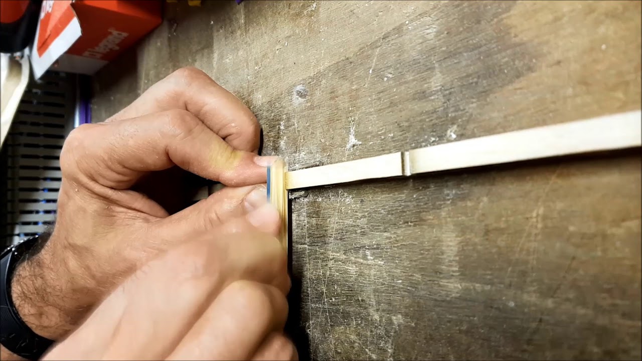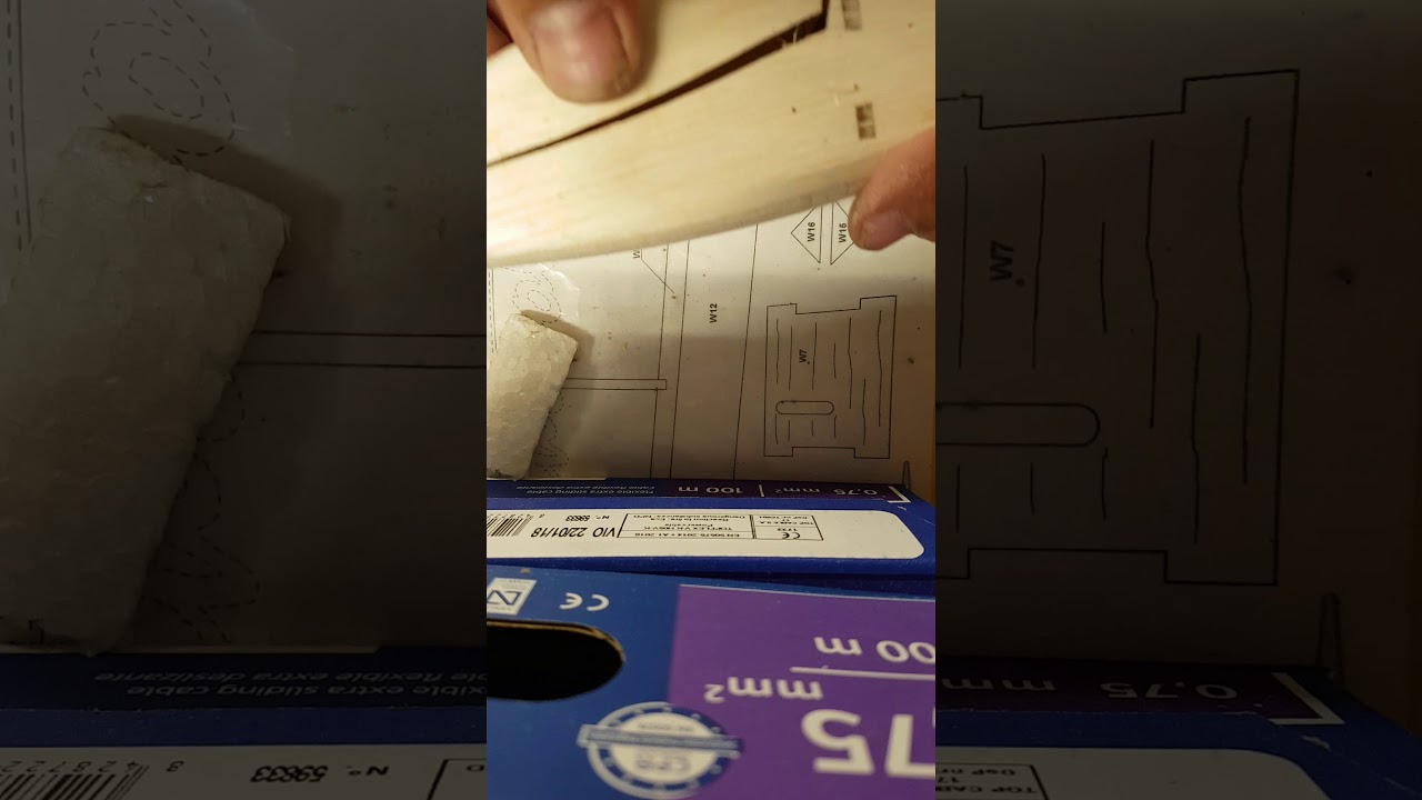 Je ponce les baguettes en biseau en venant jusqu’au fuselage à l’arrière et eu repère de la dérive à l’avant.