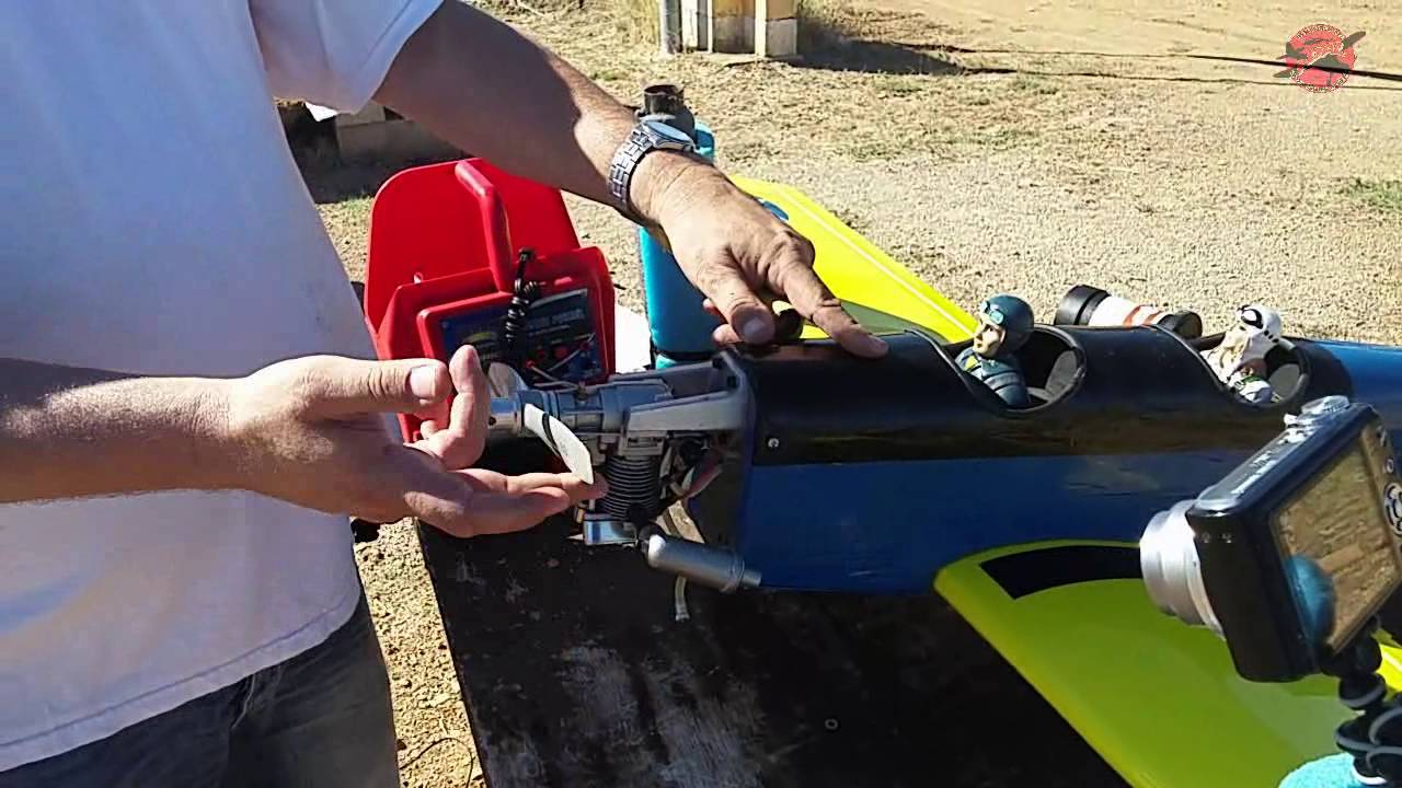 Voici l’étape délicate du démarrage du moteur. Dans cet exemple le Calmato est motorisé par un OS 46 AX (7,5cc) dont le pointeau est déporté à l’arrière.